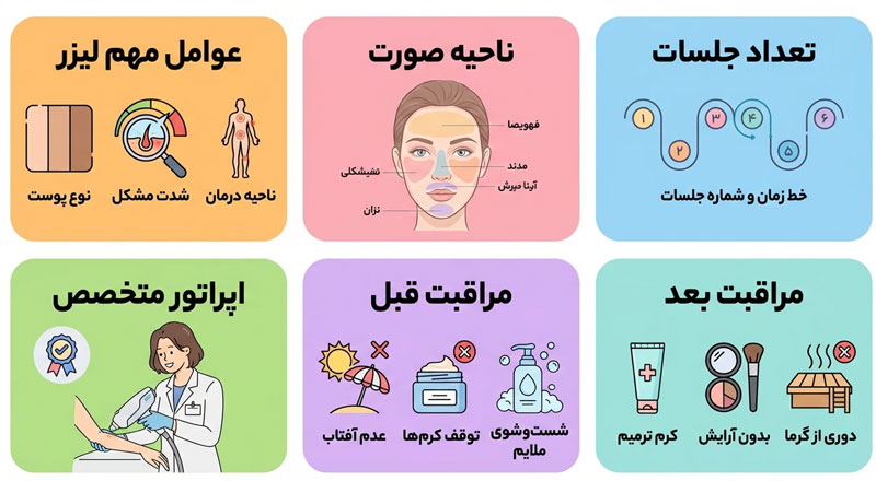 عواملی مانند نوع دستگاه لیزر، وسعت ناحیه درمان، تعداد جلسات، سطح تجربه اپراتور، موقعیت جغرافیایی کلینیک و خدمات جانبی مثل کرم و مشاوره در تعیین مبلغ نهایی موثرند. انتخاب مرکز با مشاوره و جدول قیمت شفاف، از پرداخت بیهوده یا پنهان پیشگیری خواهد کرد.